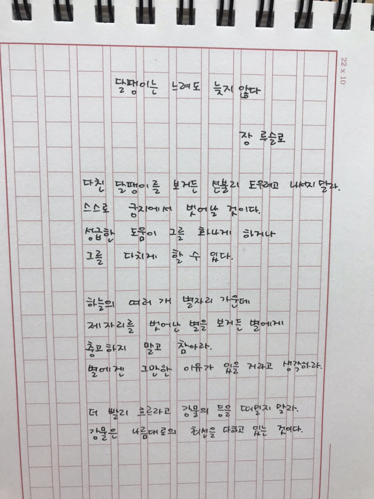 [0609] 달팽이는 느려도 늦지 않다 - 장 루슬로다친 달팽이를 보거든 섣불리 도우려고 나서지 말라.스스로 궁지에서 벗어날 것이다.성급한 도움이 그를 화나게 하거나그를 다치게 할 수 있다.하늘의 여러 개 별자리 가운데제자리를 벗어난 별을 보거든 별에게충고하지 말고 참아라.별에겐 그만한 이유가 있을 거라고 생각하라더 빨리 흐르라고 강물의 등을 떠밀지 말라.강물은 나름대로의 최선을 다하고 있는 것이다.