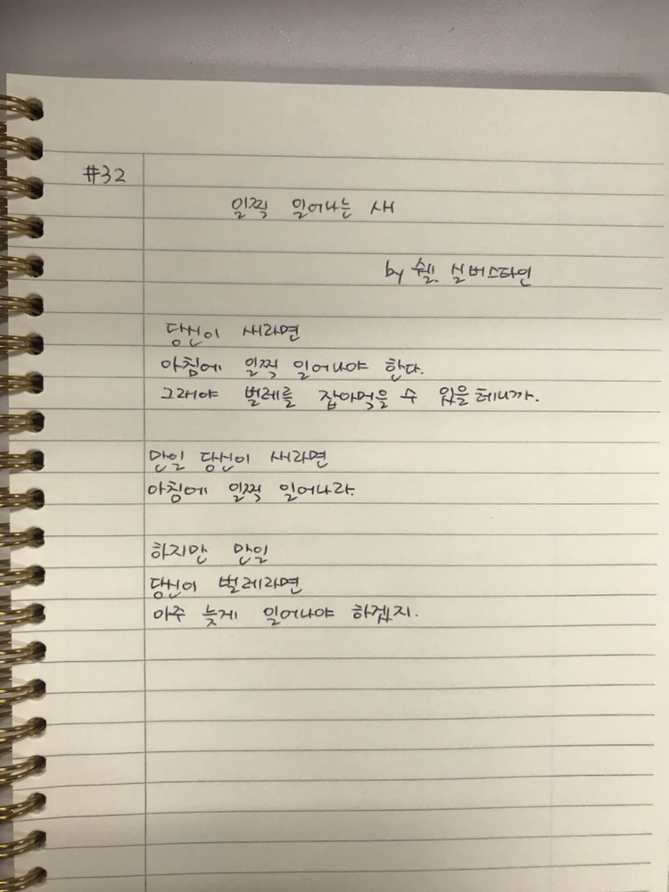 [0702] #032 일찍 일어나는 새 by.쉘 실버스타인당신이 새라면 아침에 일찍 일어나야 한다.그래야 벌레를 잡아먹을 수 있을 테니까.만일 당신이 새라면아침에 일찍 일어나라.하지만 만일당신이 벌레라면아주 늦게 일어나야 하겠지.#1일1시 #100lab