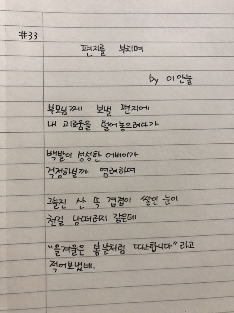 [0703] #033 편지를 부치며 by 이안눌부모님께 보낼 편지에 내 괴로움 털어놓으려다가백발이 성성한 어버이가 걱정하실까 염려하여 그늘진 산 속 겹겹이 쌓인 눈이 천 길 낭떠러지 같은데“올겨울은 봄날처럼 따스합니다”라고 적어보냈네.#1일1시 #100lab