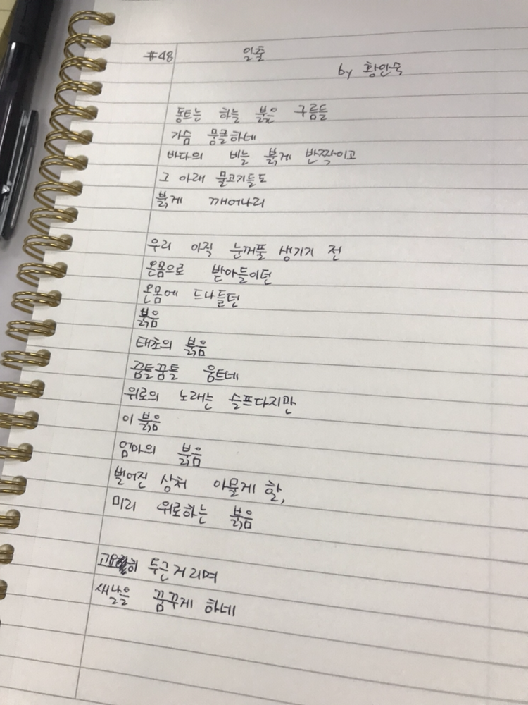 [0718] #48 일출 by 황인숙동트는 하늘 붉은 구름들가슴 뭉클하네바다의 비늘 붉게 반짝이고그 아래 물고기들도붉게 깨어나리우리 아직 눈꺼풀 생기기 전온몸으로 받아들이던온몸에 드나들던붉음태초의 붉음꿈틀꿈틀움트네위로의 노래는 슬프다지만이 붉음엄마의 붉음벌어진 상처 아물게 할,미리 위로하는 붉음고요히 두근거리며새날을 꿈꾸게 하네#1일1시 #100lab