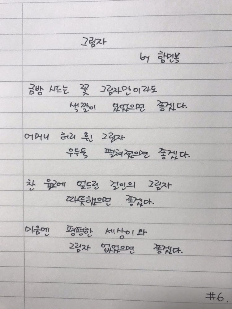 [0606] 006 그림자 by 함민복 금방 시드는 꽃 그림자만이라도 색깔 있었으면 좋겠다어머니 허리 휜 그림자 우두둑 펼쳐졌으면 좋겠다찬 육교에 엎드린 걸인의 그림자 따뜻했으면 좋겠다마음엔 평평한 세상이 와 그림자 없었으면 좋겠다#1일1시 #100lab