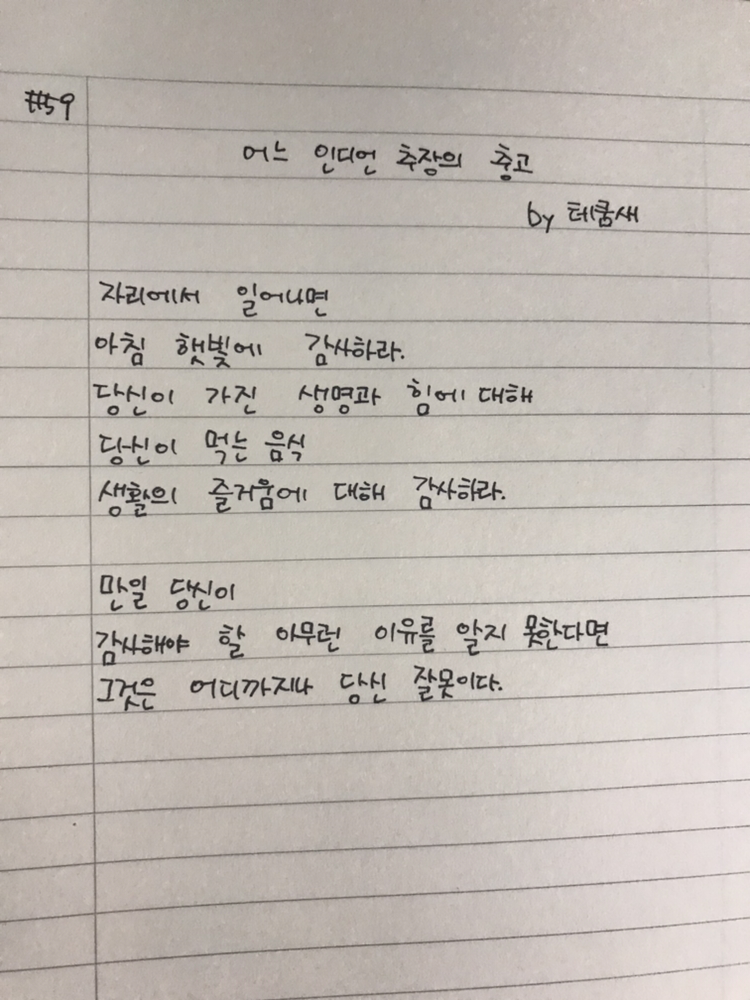 [0729] #059 어느 인디언 추장의 충고 by. 테쿰세자리에서 일어나면아침 햇빛에 감사하라.당신이 가진 생명과 힘에 대해당신이 먹는 음식생활의 즐거움에 대해 감사하라.만일 당신이감사해야 할 아무런 이유를 알지 못한다면그것은 어디까지나 당신 잘못이다.#1일1시 #100lab