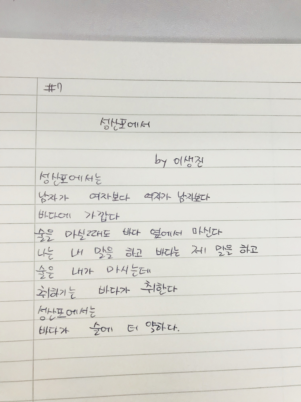 [0607] 007 성산포에서 by 이생진 성산포에서는 남자가 여자보다 여자가 남자보다 바다에 가깝다술을 마실때도 바다 옆에서 마신다나는 내 말을 하고 바다는 제 말을 하고술은 내가 마시는데 취하기는 바다가 취한다성산포에서는바다가 술에 더 약하다#1일1시. #100lab