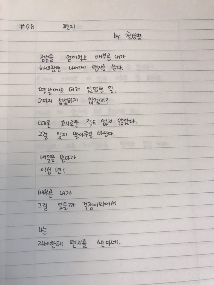[0817] #078 편지 by 천상병점심을 얻어먹고 배부른 내가배고팠던 나에게 편지를 쓴다.옛날에도 더러 있었던 일,그다지 섭섭하진 않겠지?때론 호사로운 적도 없지 않았다.그걸 잊지 말아주길 바란다.내일을 믿다가이십 년!배부른 내가그걸 잊을까 걱정이 되어서나는자네한테 편지를 쓴다네.