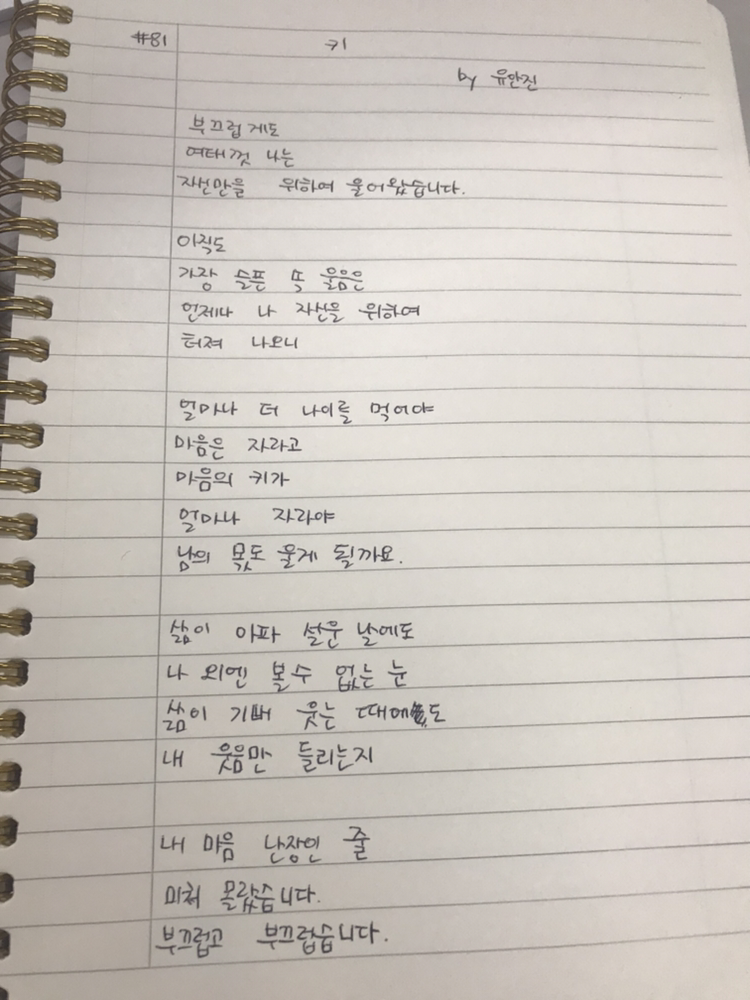 [0820] #81 키 - 유안진부끄럽게도여태껏 나는자신만을 위하여 울어왔습니다.아직도 가장 슬픈 속 울음은언제나 나 자신을 위하여 터져 나오니얼마나 더 나이를 먹어야마음은 자라고마음의 키가얼마나 자라야남의 몫도 울게 될까요삶이 아파 설운 날에도나 외엔 볼 수 없는 눈삶이 기뻐 웃는 때에도내 웃음만 들리는지내 마음 난장인 줄미처 몰랐습니다.부끄럽고 부끄럽습니다.
