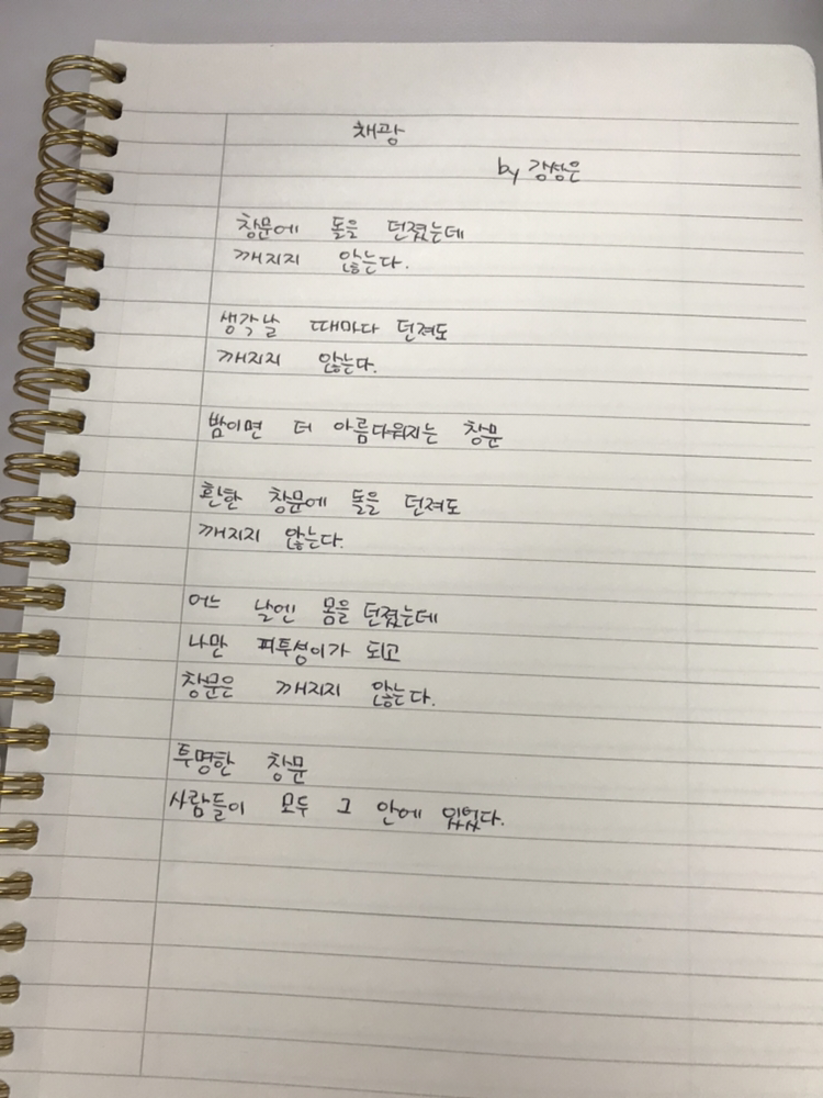 [0821] 채광 - 강성은창문에 돌을 던졌는데깨지지 않는다생각날 때마다 던져도깨지지 않는다밤이면 더 아름다워지는 창문환한 창문에 돌을 던져도깨지지 않는다어느 날엔 몸을 던졌는데나만 피투성이가 되고창문은 깨지지 않는다투명한 창문사람들이 모두 그 안에 있었다