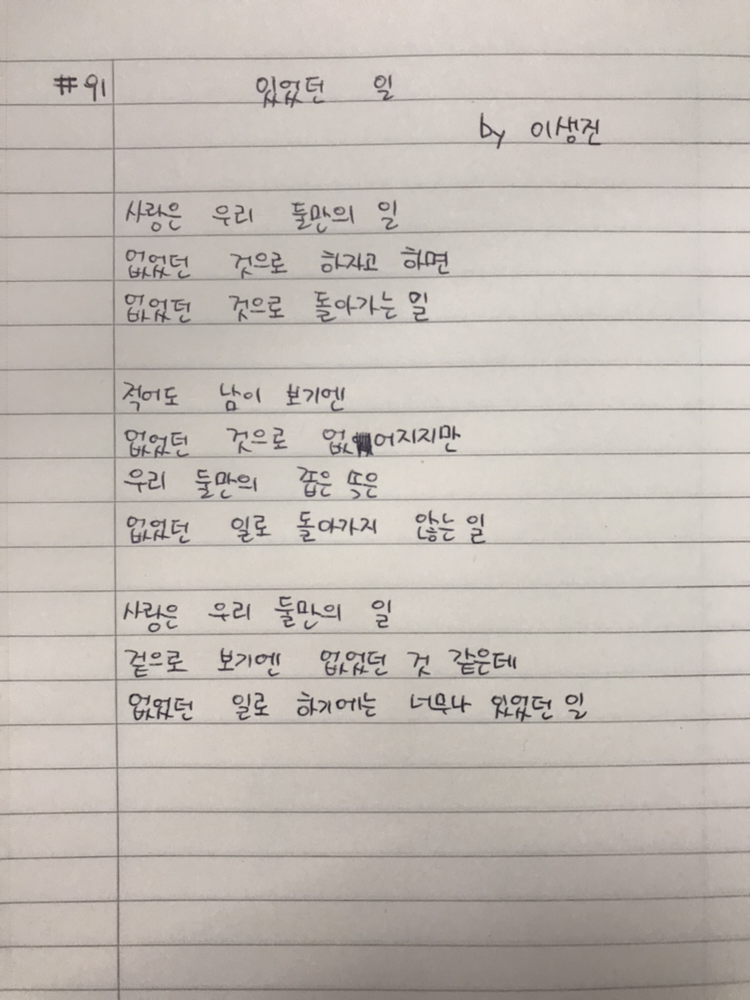 [0830] #091 있었던 일 by 이생진사랑은 우리 둘만의 일없었던 것으로 하자고 하면없었던 것으로 돌아가는 일적어도 남이 보기엔없었던 것으로 없어지지만우리 둘만의 좁은 속은없었던 일로 돌아가지 않는 일사랑은 우리 둘만의 일겉으로 보기엔 없었던 것 같은데없었던 일로 하기에는 너무나 있었던 일#1일1시 #100lab