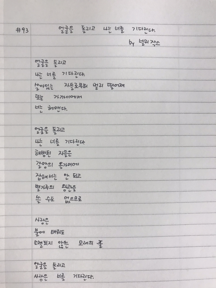 [0901] #093 얼굴을 돌리고 나는 너를 기다린다 / 넬리 작스얼굴을 돌리고나는 너를 기다린다살아있는 자들로부터 멀리 떨어져또는 가까이에서너는 헤맨다얼굴을 돌리고나는 너를 기다린다해방된 자들은갈망의 올가미에잡혀서는 안 되고별가루의 왕관을 쓸 수도 없으므로사랑은불에 태워도소멸되지 않는 모래의 풀얼굴을 돌리고사랑은 너를 기다린다