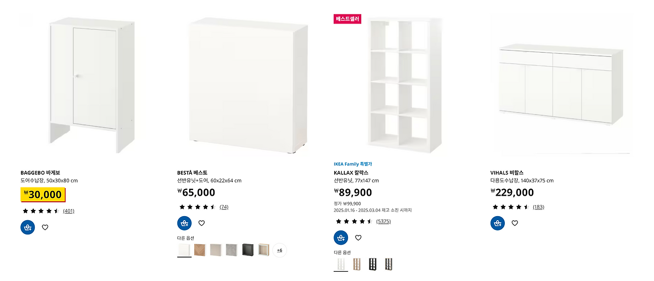 바게보(BAGGEBO), 베스토(BESTÅ), 칼락스(KALLAX), 비할스(VIHALS), 쇠데르함(SÖDERHAMN).