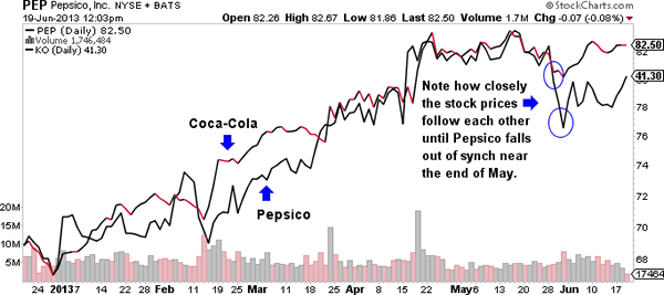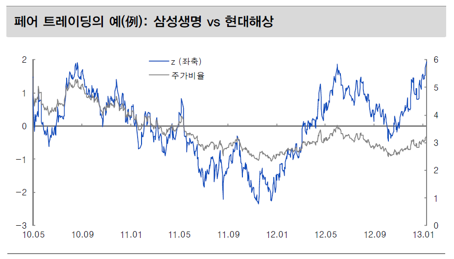 그 다음으로는 통계적 아비트라지라고 하면 가장 많이 언급하는 페어 트레이딩(Pair Trading)이다. 두 개의 관계가 깊은 상품을 골라서 그 관계가 일시적인 시장 상황 때문에 벌어지면 원래대로 돌아오게 되는 것을 이용해서 떨어진 것은 사고 올라간 것은 파는 전략이다. 예를 들어 코카콜라와 펩시의 주가 움직임은 매우 비슷한데, 이 둘이 벌어졌을때 펩시를 사고 코카콜라를 매도 하는 것이다.