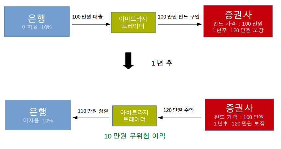 이러면 은행에서 100만 원을 빌려서 펀드를 사고, 1년 후에 120만 원을 돌려받은 다음에 빌린 원금 100만 원에 이자 10만 원을 갚으면 (증권사가 부도나는 것을 제외한) 아무런 위험 없이 10만 원을 벌게 된다. 사실 이 펀드는 109만 원 정도 해야 하는 펀드인데 100만 원에 팔아서 이런 아비트라지가 발생한 것이다.