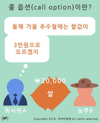 어떤 물건을 정해진 가격에 살 수 있는 권리를 '콜 옵션'이라고 하고, 정해진 가격에 팔 수 있는 권리를 '풋 옵션'이라고 한다. 만약에 김치 제조 업체에서 배추 콜 옵션을 가지고 있다면, 배추값이 폭등하여도 큰 손해 없이 배추를 안정적으로 확보할 수 있다. 배추를 재배하는 농민이 배추 풋 옵션이 있다면 아무리 배추값이 폭락하여도 배추를 일정 가격에 팔 수 있어서 심각한 위험에 처하지는 않게 된다.