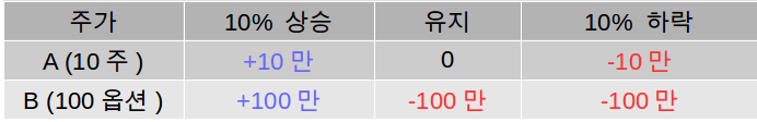 예를 들어 100만 원으로 A는 10만 원짜리 주식을, B는 1만 원짜리 콜옵션에 투자를 한다고 생각해보자. 콜옵션은 "주식을 10만 원에 1주 살 수 있는 권리"라고 하자.