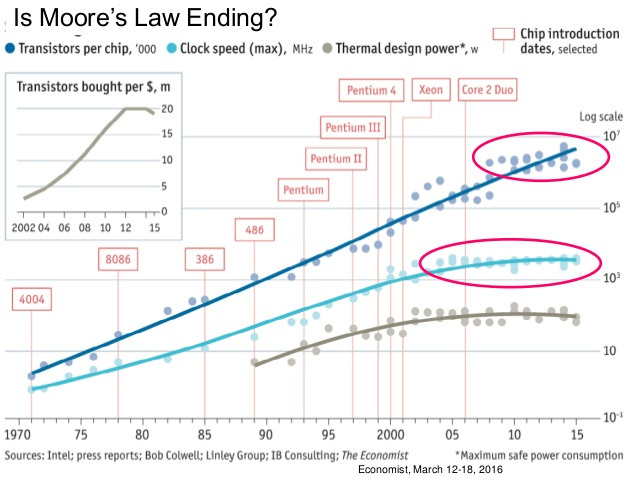 그 이후로 프로세서의 속도는 거의 빨라지지 않았다. 그래프에서 반도체의 클럭 스피드인 하늘색을 보면 2005년 즈음부터 더 이상 증가하지 않는다는 것을 볼 수 있다. 이대로 무어의 법칙은 깨지는 것일까?