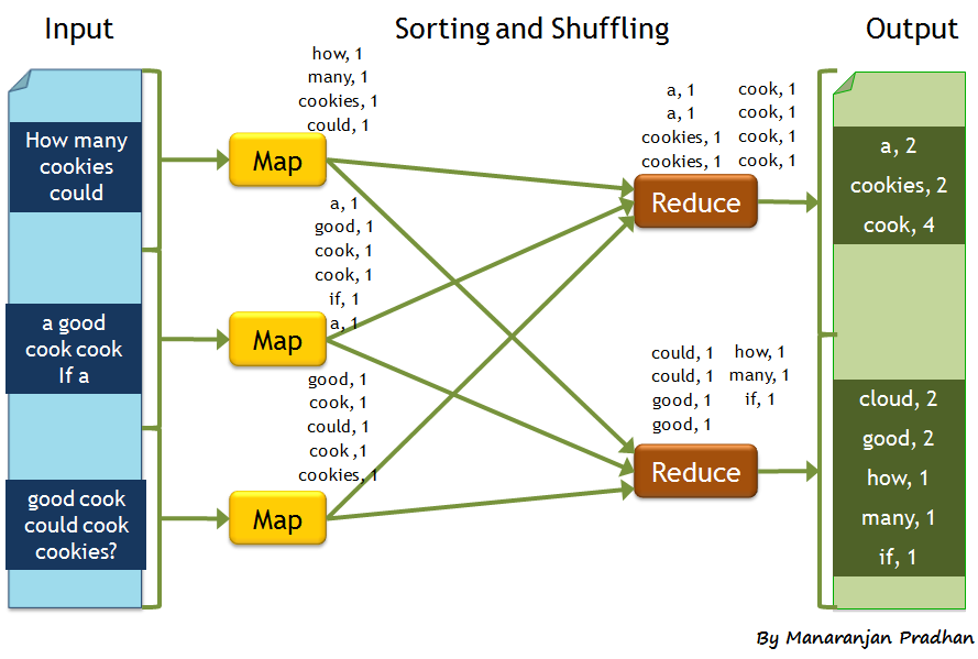 이러한 시스템 설계를 간단하고 강력하게 만든 시스템이 바로 구글의 유명한 맵리듀스(MapReduce)이다. 맵리듀스는 복잡한 설계 없이 맵과 리듀스 두 가지 행동 방식을 주면 결과를 계산하는 기술이다. 맵은 주로 데이터를 변환하거나 추출하는 방법이고, 리듀스는 추출해낸 데이터를 처리하는 방법을 말한다.
