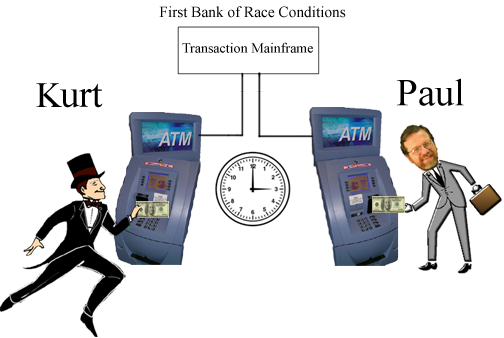 공유 자원에 대한 처리도 조심해야 한다. 예를 들어, 계좌에 100만 원이 있는데 50만 원 입금과 30만 원 출금을 동시에 처리한다고 해보자. A 프로세서는 100만 원에 50만 원을 추가해서 150만 원이 될 것이다. B 프로세서는 A가 아직 업데이트하기 전에 100만 원에서 30만 원을 출금해서 70만 원이 된다. 원래는 120만원이 되어야 하는데 결과가 70만원이나 150만원 중에 무엇이 될지 모르는 상태가 된다. 이러한 상태를 두 프로세서가 계좌를 서로 가지려고 한다 해서 경쟁 상태(Race Condition)라고 한다. 이러한 부분을 철저히 처리하지 않으면 심각한 오류를 야기 할 수도 있다.
