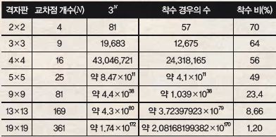 바둑도 마찬가지다. 바둑의 경우의 수는 우주의 원자수 보다 많아서 모든 경우의 수를 다 계산하려면 현재 컴퓨터로 10^111년이 걸린다고 한다. '딥블루'의 방식으로 바둑 인공지능을 만들면 아마도 인류가 멸망할 때까지 한판도 못 둔다.