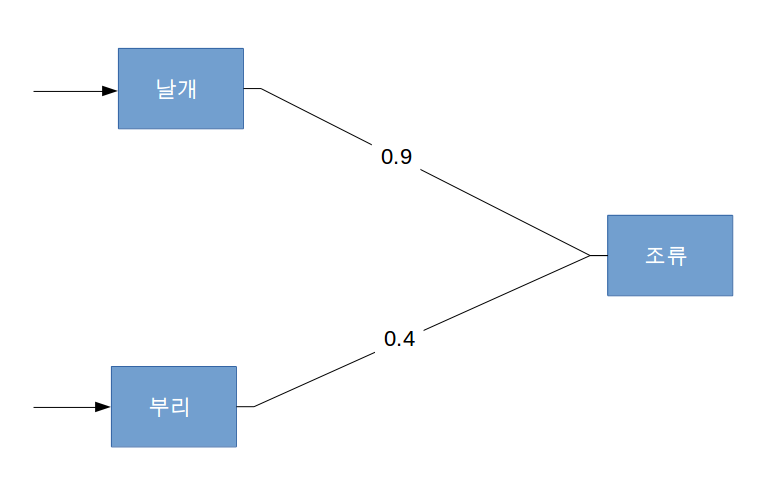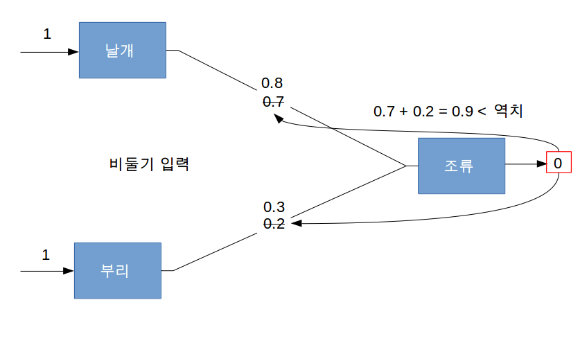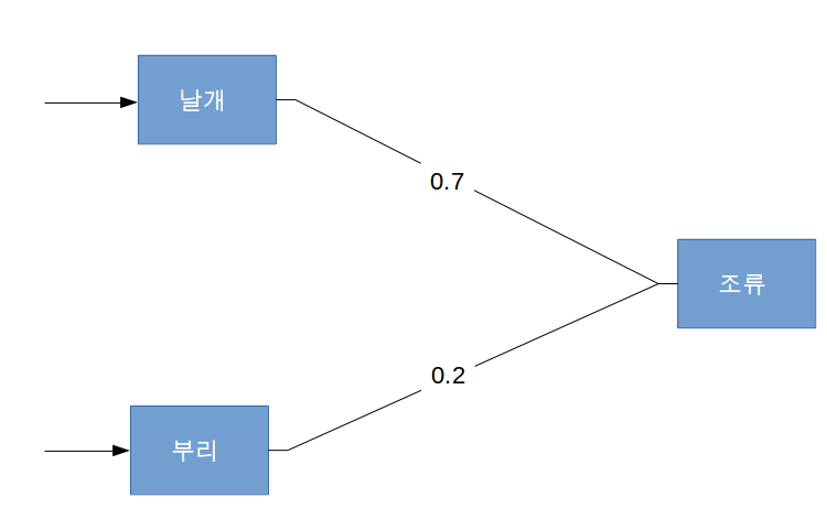 뉴런과 뉴런 사이 시냅스 가중치(weight)는 처음에 무작위로 설정했다. 여기서는 0.7, 0.2이다. 현재로는 제대로 된 조류 판단을 하지 못 한다. 실제로 그런지 데이터를 입력해보자.