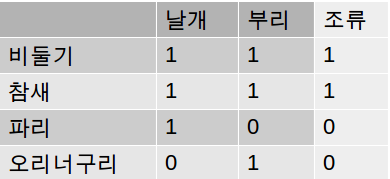 역시나 이론상으론 어렵기 때문에 예를 들어보자. 부리와 날개가 있는지 없는지 여부를 가지고 입력한 동물이 조류인지 아닌지 체크하는 인공 신경망을 만들어보자. 데이터는 다음과 같다고 하자. 1은 참이고 0은 거짓을 표현한다.