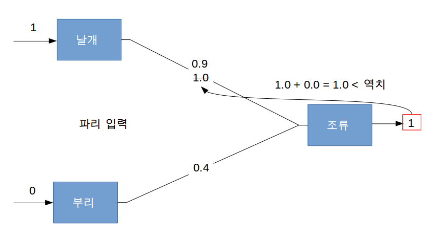 만약에 가중치가 1.0, 0.4인데 파리가 들어온다면 어떨까?