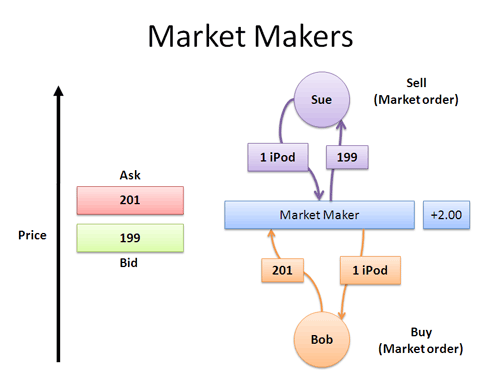 은행이나 헤지펀드와 같은 많은 기관 트레이더들이 많이 구사하는 트레이딩 전략으로 '마켓 메이킹'이라는 것이 있다. 시장 조성자라는 뜻인 이 전략은 싼 가격에 사면서 동시에 비싼 가격에 팔아서 차액을 버는 트레이딩 방법이다. 이는 마치 중고차 딜러나 금은방 주인과 비슷하다. 중고차 딜러는 차를 팔려는 사람에게 그들이 만족할만한, 그렇지만 비교적 싼 가격을 제시해서 차를 매입하고 그 차를 필요한 사람에게 좀 더 비싼 값에 팔아서 수익을 얻는다. 금은방도 비슷한 원리로 금은 팔고 싶어 하는 사람에게서 금을 구입하고 이를 다시 좀 더 비싼 값에 판매하여서 수익을 얻는다. 가장 쉽게 찾을 수 있는 마켓메이커는 공항 환전소를 생각하면 된다. 달러를 1100원에 사서 1160원에 팔면서 1달러당 60원의 차액을 버는 것이다.