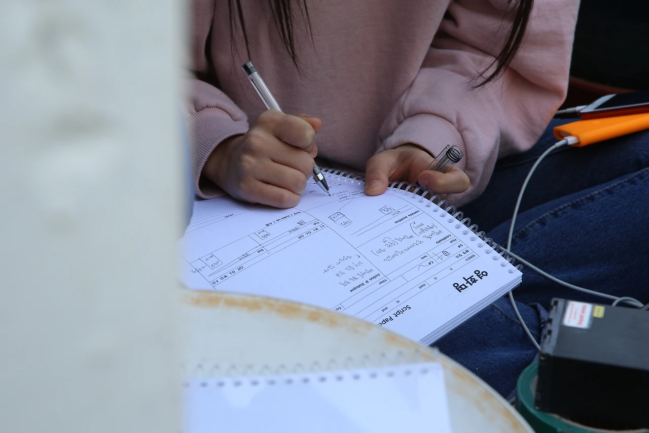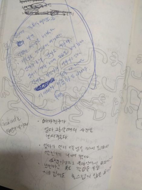 시나리오 소재 개발 작업은 개강 전 2월부터 시작됐다. 1, 2 학년 시나리오 실습수업 때마다 제대로 시나리오를 완성하지 못했던 터라, 시작 전부터 이번 작업에서도 시나리오가 쉽게 나올 것이라고는 생각하지 않았다. 없는 이야기를 꾸며내는 작업에 워낙 자신감이 없었기 때문에, 지금 내 주변에서 일어나는 일들 혹은 과거 경험을 중심으로 소재 발굴을 시작하였다. 매일 같이 카페에 하루 종일 앉아서 1-2주가량을 노트북과 씨름하면서 시간을 보냈지만 마음만큼 소재가 떠오르지 않았다. 답답한 마음에 1주일간 내일로 여행을 혼자 다녀왔다. 출발 전 조그만 수첩을 하나 사서 그때그때 떠오르는 생각들을 빠짐없이 메모했다.