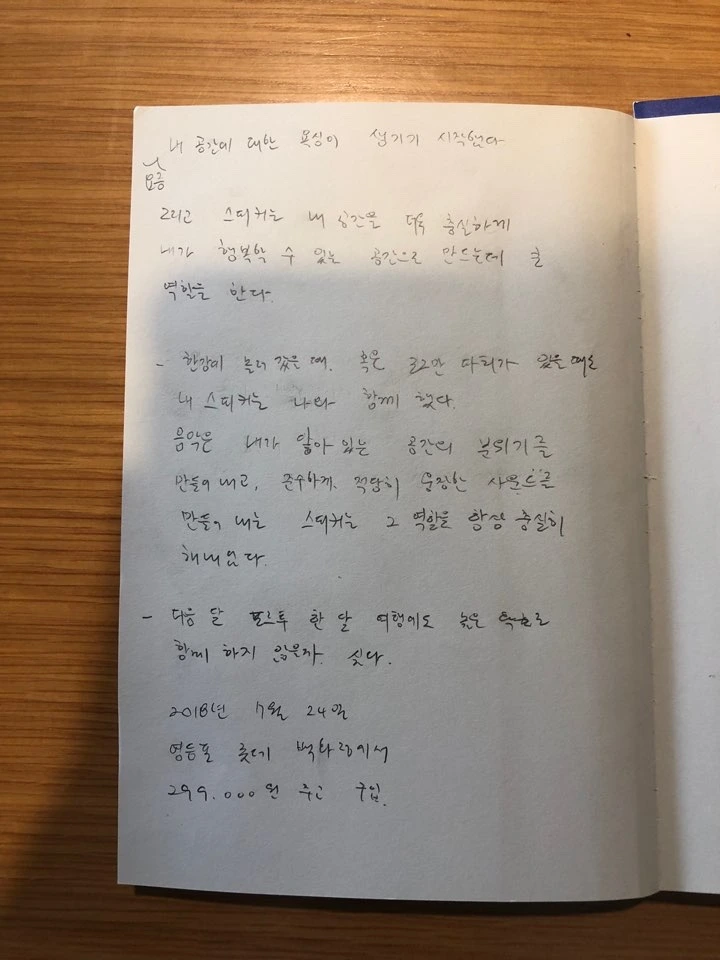 한강에 놀러 갔을 때, 혹은 조그만 파티가 있을 때도 스피커는 자주 나와 함께했다. 음악은 내가 닿아있는 공간의 분위기를 만들어낸다. 준수하게, 적당히 웅장한 사운드를 뽑아내는 스피커는 그 자리에서 자기의 역할을 충실히 해내었다. 항상.