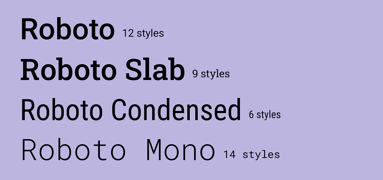 구글 폰트 중 가장 인기 많은 폰트는 무엇일까요? 바로 안드로이드 유저에게 친숙한 그 폰트, 로보토(Roboto)입니다. 구글의 디자이너 Christian Robertson이 디자인 한 로보토는 2011년에 안드로이드 4.0 "Ice Cream Sandwich"의 시스템 폰트로 소개되었고, 2014년 한 번의 리디자인 과정을 거쳐 지금까지 사용되고 있습니다. 유튜브, 구글맵, 구글 플러스 등 다른 구글 서비스에서 많이 이용되고 있으며, 당당히 가장 인기 있는 구글 폰트의 자리도 차지하고 있지요.