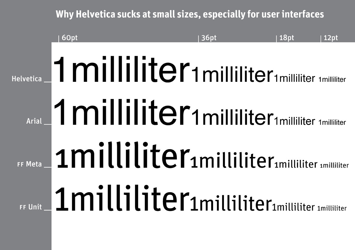 샌프란시스코 이전 애플은 Helvetica를 시스템 폰트로 사용했었습니다. 1957년에 만들어진 헬베티카는 지금까지도 많은 디자이너의 사랑을 받는 폰트 중 하나입니다. 하지만 헬베티카가 만들어진 1957년은 디지털 스크린이 없던 시대였습니다. 당연히 스크린에서의 가독성을 고려할 수 없었던 시대였죠. 그래서인지 작은 스크린에서의 헬베티카의 사용성에 대해 지적하는 디자이너들이 많았습니다. 그중 한 명이었던 독일 출신의 타입 디자이너 Erik Spiekermann*은 아래의 이미지를 자신의 블로그에 게시했었습니다. 헬베티카의 취약점을 한눈에 볼 수 있었지요.