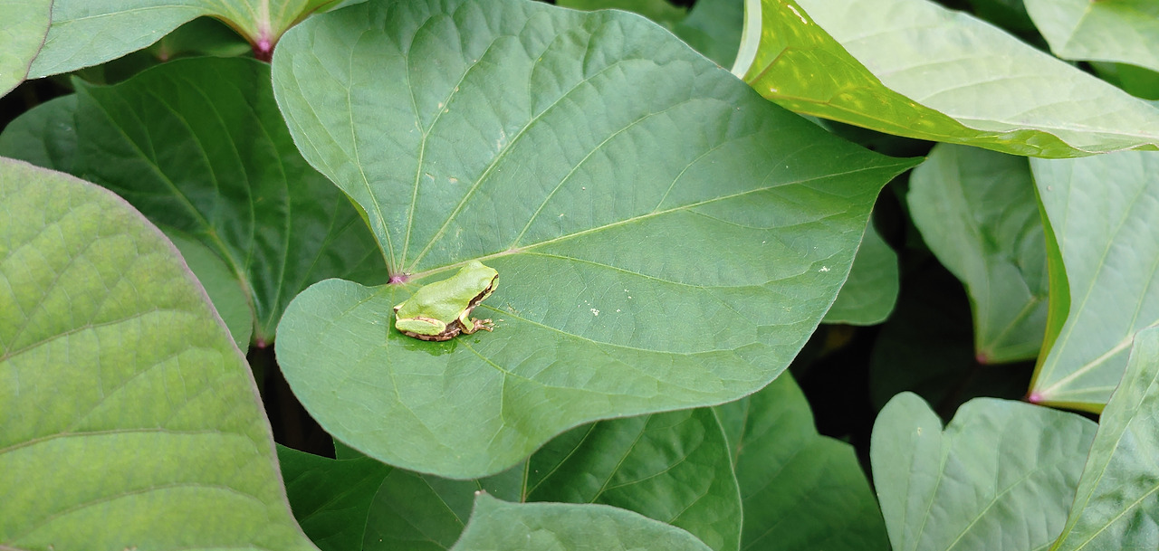 텃밭 고구마잎에 앉아있던 청개구리가 귀엽다