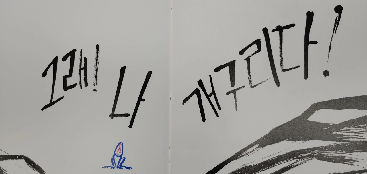자생그(자꾸 생각나는 그림)를 말했다. 종민이가 맨 뒷장 그림을 가리키며 “개구리가 귀여워요.” 말했다. 뒷다리가 살짝 나온 부분을 지목하던 해주는 “가까이서 보니까 뒷다리가 있네요.” 했다. “그것까지 보다니 해주, 넌 관찰력이 뛰어나구나!”라고 내가 말했다.