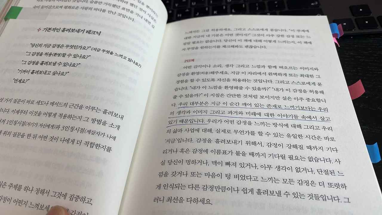 우리의 대부분은 지금 이 순간 깨어 있는 존재로 느끼기보다는 우리의 생각과 이미지 그리고 과거와 미래에 대한 이야기들 속에서 살고 있기 때문입니다. 우리가 어떤 감정을 느끼는 방식에 대해 그리고 우리의 삶과 사업에 대해, 실제로 무언가를 할 수 있는 유일한 시간은 바로 '지금'입니다. 감정을 흘려보내기 위해서, 감정이 강해질 때까지 기다리거나 혹은 감정에 이름표가 붙을 때까지 기다릴 필요는 없습니다. 사실 당신이 멍하거나, 맥이 빠져 있거나, 아무 생각이 없거나, 단절된 느낌을 갖거나 또는 마음이 텅 비었다고 느끼는 모든 감정은 더 또렷하게 인식되는 다른 감정만큼이나 쉽게 흘려보낼 수 있는 것들입니다. 그러니 최선을 다하세요.