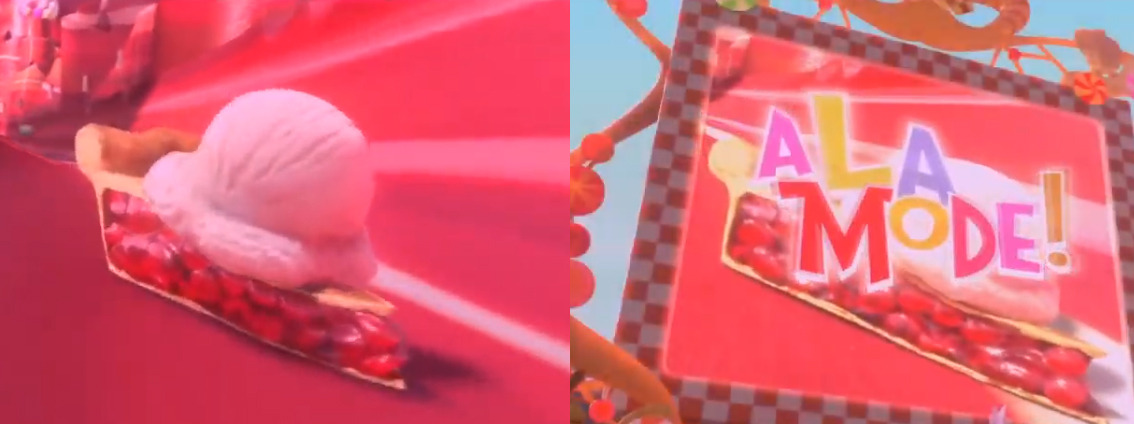 레이싱 장면에서도 깨알 같은 장난들이 등장한다. 파이와 과자로 만든 카트를 타며 흡사 '마리오 카트'를 연상시키는<슈가러쉬>의 레이스는 각종 장애물과 함께 상대 레이서를 방해하는 다양한 아이템이 등장하는데, 아이스크림을 발사해 다른 레이서를 덮어 씌우자 전광판에서 'A LA MODE!'라는 글씨가 튀어 나온다. 파이나 케이크 위에 아이스크림을 얹어서 먹는 디저트의 이름이다. 바로 다음 장면에서는 케이크 트랙을 따라 심겨 있는 체리 꼭지에 불을 붙이자 체리가 폭발하며 뒤따라 오는 레이서들을 위협하기도 한다. 이때 중계석에서 'Cherry bomb!'이라고 외치는 소리가 들려오는데, 실제로 우리가 '폭탄'하면 흔히 떠올리는 둥근 폭약에 심지가 삐져나온 모양의 폭탄을 'Cherry Bomb'이라고 부른다. 미국 어린이들이 가지고 놀던 폭약 장난감의 이름이기도 했는데, 한국 아이들이 '콩알탄'을 가지고 놀았다면 미국 아이들은 'Cherry Bomb'을 가지고 놀았던 셈이다.