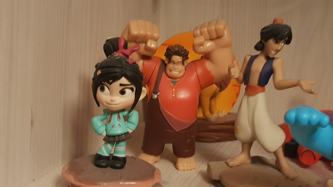 이 정도면 거의 '랄프예찬가'다. 정말이지 내게 <주먹왕 랄프> 1편은 흠잡을 곳 없이 속속들이 만족스러운 작품이었다. 그에 반해 디즈니의 대접은 서럽기 그지 없는 수준이다. 디즈니의 온갖 인형과 피규어들을 사모으는 와중에도 랄프와 바넬로피는 좀처럼 살 수 있는게 변변찮다. 그나마 플레이스테이션 게임 <디즈니 인피니티>의 캐릭터를 구매하면 주는 스태츄가 괜찮은 편이었고, 정작 디즈니 스토어에서 파는 정식 굿즈들은 더 처참하게 생겼다. 유럽의 어느 장난감 매장에서 찾은 랄프가 그래도 만듦새가 나쁘지 않았는데, 이 쪽도 얼굴은 안타까운 수준. 주인공 4인방이라 할 수 있는 펠릭스와 칼훈은 그마저도 찾기 힘들다.