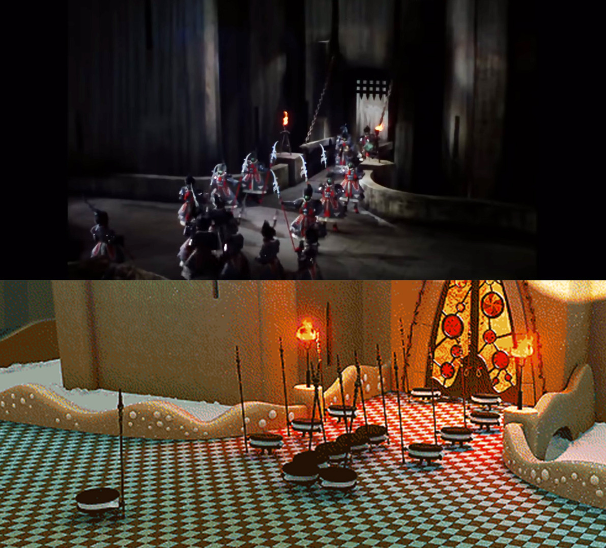 또 <슈가러쉬> 속 캐릭터들은 다양한 종류의 디저트로 묘사되는데, 그 중 킹캔디의 성을 지키는 오레오 병사들은 '오-레-오! 오레ㅡ오!'하는 구령을 외치며 행진하고 있다. 이것만 봐도 웃음이 나지만 사실 이 병사들은 저 유명한 1939년판 영화 <오즈의 마법사>의 패러디다. 사악한 서쪽 마녀의 성을 지키는 병사들의 행진 구령소리를 그대로 가져왔다. 물론 <오즈>에서는 '오레오'라고 하진 않고, 영어인지 뭔지 모를 다른 소리를 외치고 있는데 '오레오'와 굉장히 비슷하게 들린다. 아마 이 고전영화를 보던 사람들이 저 구령소리가 '오레오'처럼 들린다고 농담하다가 나오게 된 장면이 아닐까. 심지어 장면의 앵글과 병사들의 행진 모습까지 똑같다.