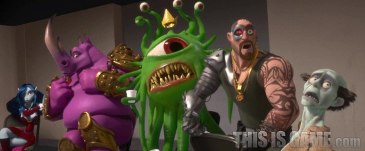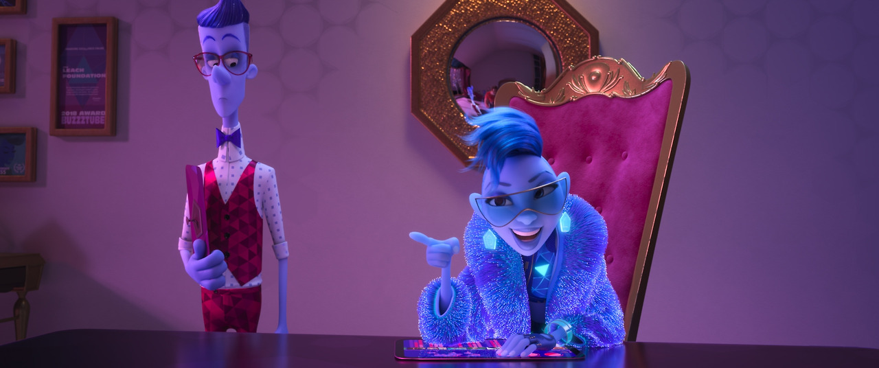 문제는 이러한 묘사들이 1편의 그것보다 훨씬 평면적이라는 거다. 메트로폴리스를 연상시키는 거대한 인터넷 도시, 그 속을 누비는 '마인크래프트' 스타일의 유저 아바타들은 인터넷 세상을 의인화하려는 이가 가장 쉽게 생각할 수 있는 1차원적인 묘사다. 하이퍼링크를 이동하는 비행 자동차나 무엇을 묻든 대답해주는 포털 사이트 역시 그리 새롭지 않다. 물론 웃음을 자아내는 기발한 재현들도 분명 있다. 포털 사이트의 자동완성이나, 무서운 속도로 리트윗을 지저귀는 파랑새들, 팝업 차단 서비스를 묘사한 장면들은 보자마자 웃음이 나온다. 특히 <슬로터 레이스>를 플레이하는 유저 캐릭터들의 산만한 움직임에서 역시 '게임'에 있어서만큼은 녹슬지 않은 위트를 느낄 수 있다. 문제는 이러한 요소들이 1편처럼 이야기와 유기적으로 연계되는 것이 아니라 단편적인 웃음거리에 머무른다는 점이다.