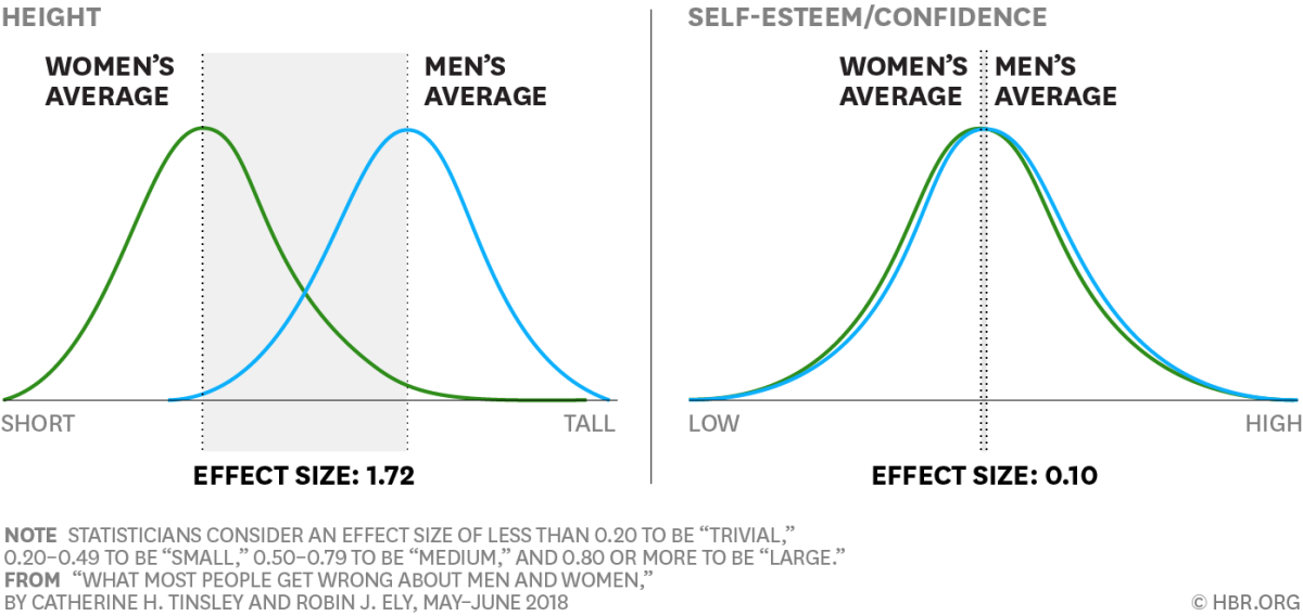 현실의 반영이라고는 하지 말자. 실제로 여자는 어릴 때부터도 그렇게 어른스럽더라, 남자는 커도 애야 애 같은 소리를 듣자고 쓴 글은 아니다. 통계적으로 성별에 따른 성격과 행동양식의 차가 없는 건 아니지만, 성별과 무관한 개인들의 차이와 비교하면 성차는 무의미한 수준이다. 신체의 차이는 당연히 있다. 하지만 그밖의 차이는 있다 하더라도 오른쪽 그래프와 같은 수준이다. 평균값에서는 약간의 차이가 있을 지 몰라도 개인 각각의 문제가 되면 그 평균의 차이는 의미가 없어진다. 개인은 개인일 뿐이다. 성별은 그 개인을 잘 모를 때의 참고사항 정도다. 개인을 잘 알게 되었는데 그 개인이 기존의 성관념과 다르다면 성관념을 폐기하면 될 일이다. 개인이 특이하다고 생각할 일이 아니라.