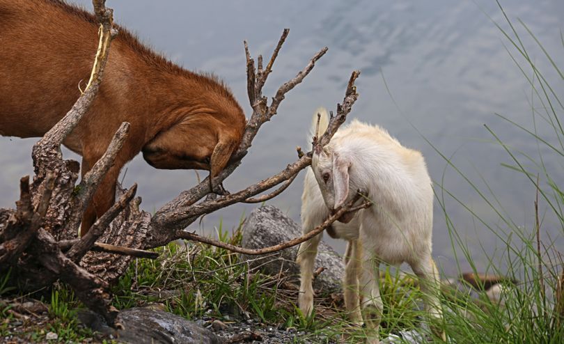 뿔이 나는 중이라 가려운 건지 나무에 머리를 열심히 비비고 있는 베그나스 호숫가의 염소들.