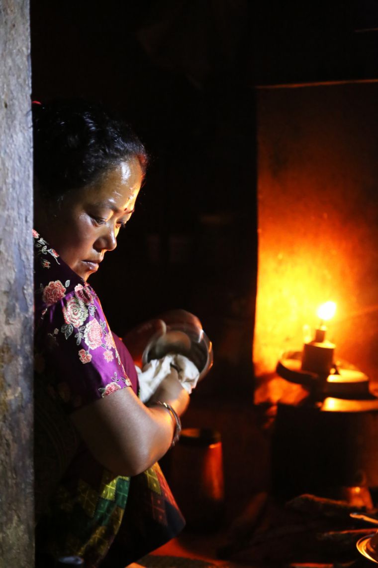 전통적인 구조의 부엌이다. 이 부엌의 아궁이 앞에서 대부분의 요리가 이루어지고, 이 바닥에 그대로 앉아 식사도 한다. 수도시설은 보이지 않는다. 마당에 받아놓은 물로 식재료를 적당히 씻어내고, 식기는 헝겊으로 닦아낸다.