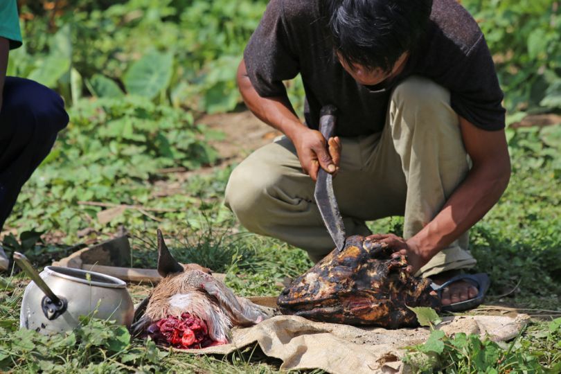 당연한 얘기지만, 잔치에 쓰이는 모든 것은 자급자족이다. 마을 사람들이 넉넉히 먹을 모양인지 내가 본 것만 염소를 두 마리 잡았다. 몸통은 적당히 해체해서 고기를 발라내겠지만, 머리는 또 머리 나름대로의 쓰임이 있는 것 같다. 따로 잘라내어 불에 털을 그슬린 후, 네팔의 전통 칼인 쿠크리로 긁어내고 있다.