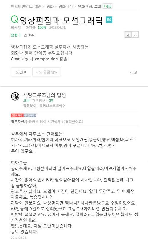 특히 이렇게 특정 산업이나 기술과 관련된 언어들은 그 기술의 발달과 함께 만들어지는데, 한국이 그 기술을 주도적으로 만들어온 나라가 아닌 이상 결국 촬영/방송 용어들은 일본어가 아니면 영어 문화권에서 만들어진 말이 된다. 일본어를 대체하기 위해 굳이 영어 용어를 쓰는 것도 어색한 일인 것은 마찬가지다. 그렇다고 국립국어원에서 억지스럽게 만든 것 같은 순화어를 굳이 찾아야 할까 싶기도 하다. '댓글'이나 '누리꾼'처럼 어느 정도 정착한 말들도 물론 있지만, 스마트폰을 '똑똑전화'로 쓸 수는 없잖아.