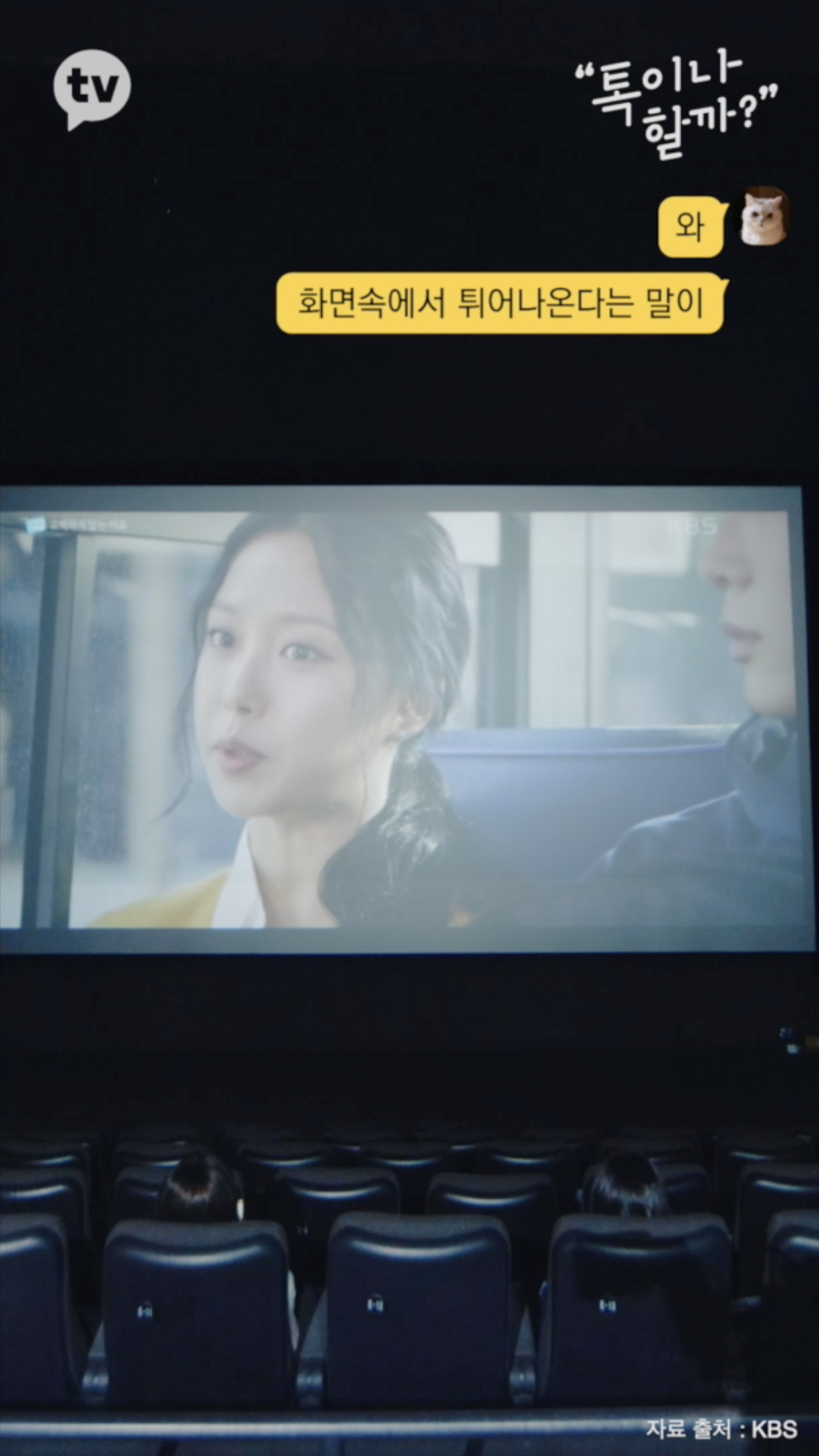 2회의 박은빈 편에서도 활용했던 이 객석의 그림을 이번엔 영화관으로 변주해 보았다. 실제로도 큰 소리를 낼 수 없는 공간인 상영관의 어두운 조명은, 카톡을 주고받는 분위기에도 현실감을 더한다. 그중에서도 구 피카디리였던 극장을 선택한 것은 극장 안에 영화와 관련된 이런저런 오브제들이 있었기 때문인데, 프로그램의 구성상 인트로에만 몇 컷 쓰고 실제 촬영에는 상영관 내부만 하염없이 나올 수밖에 없었다.