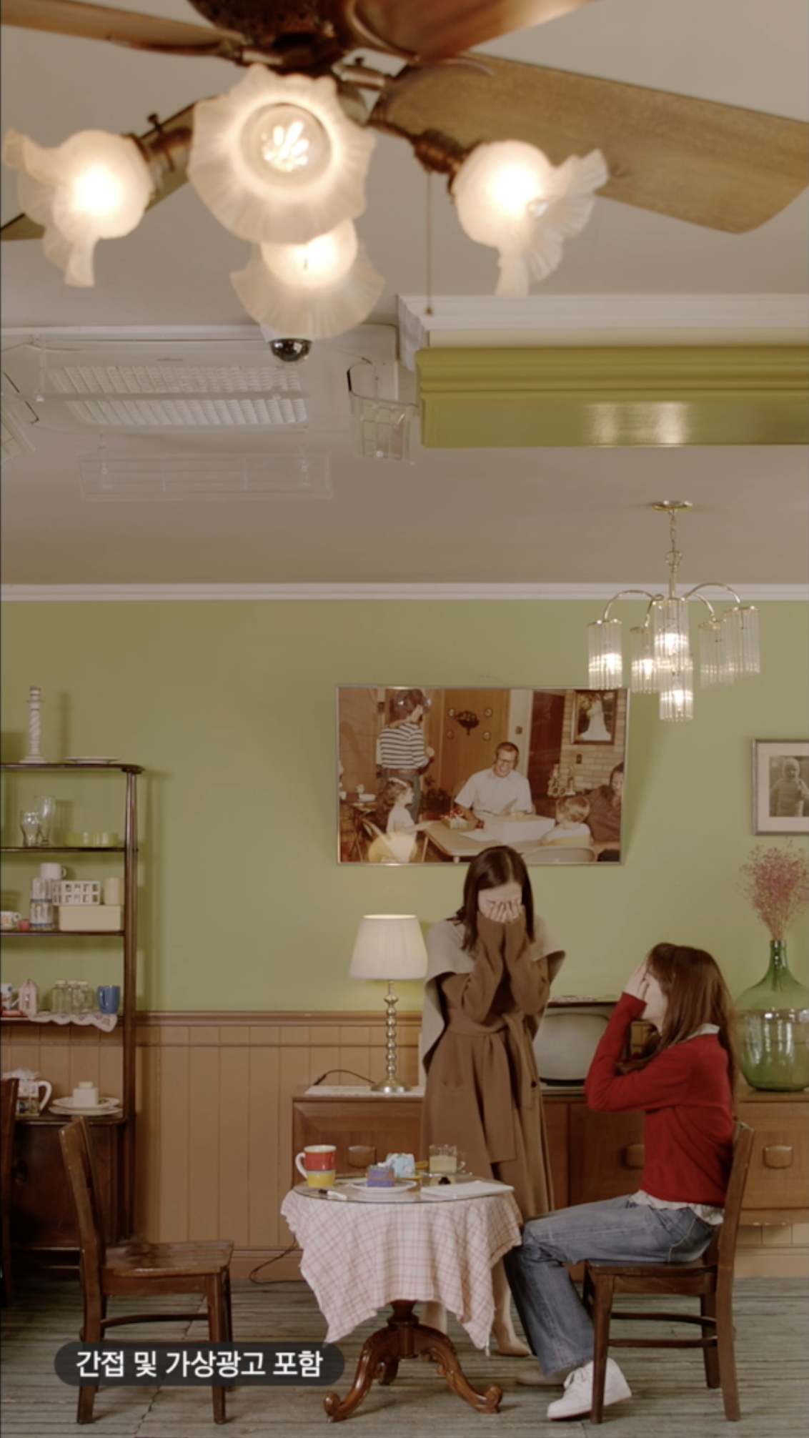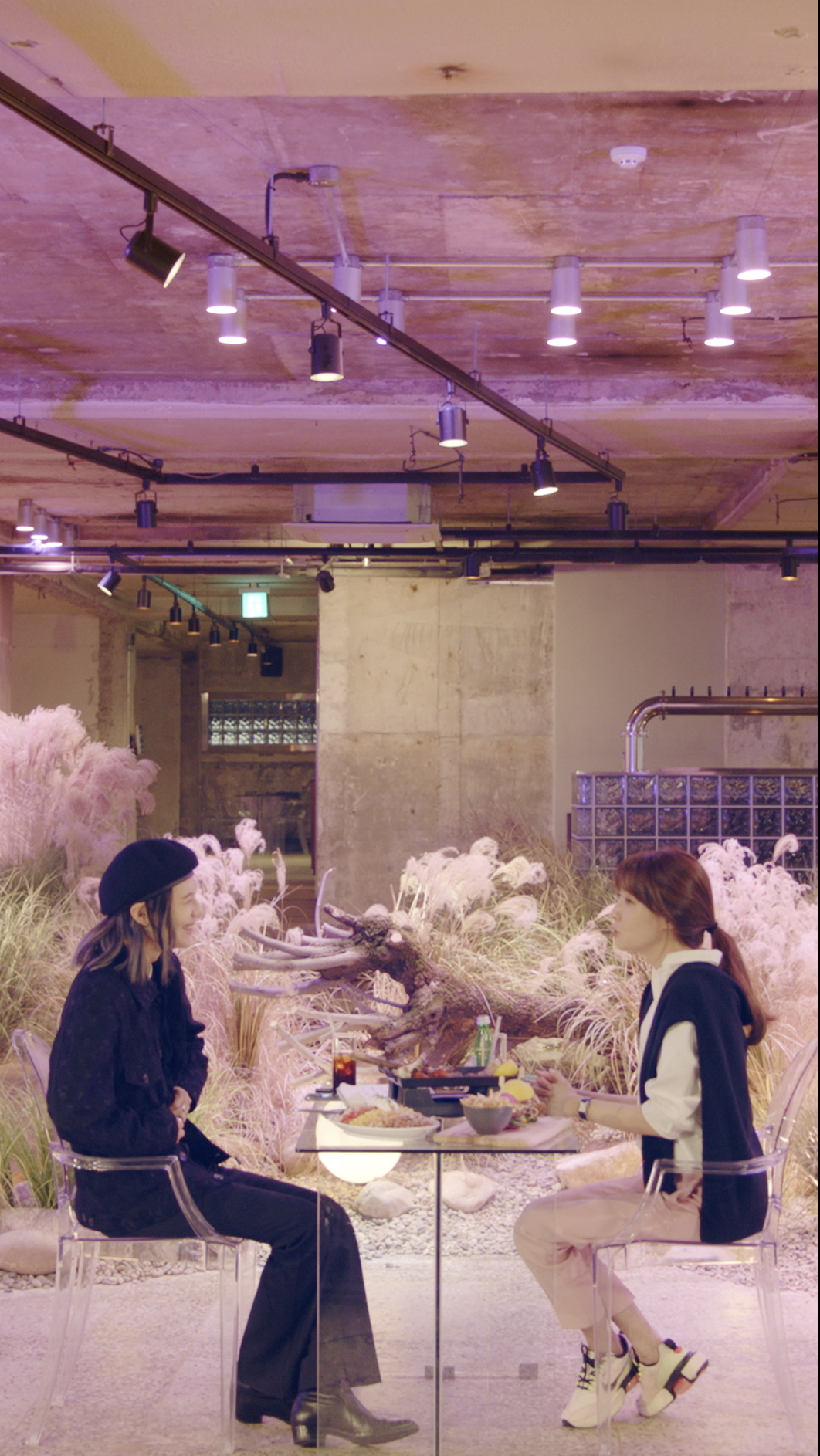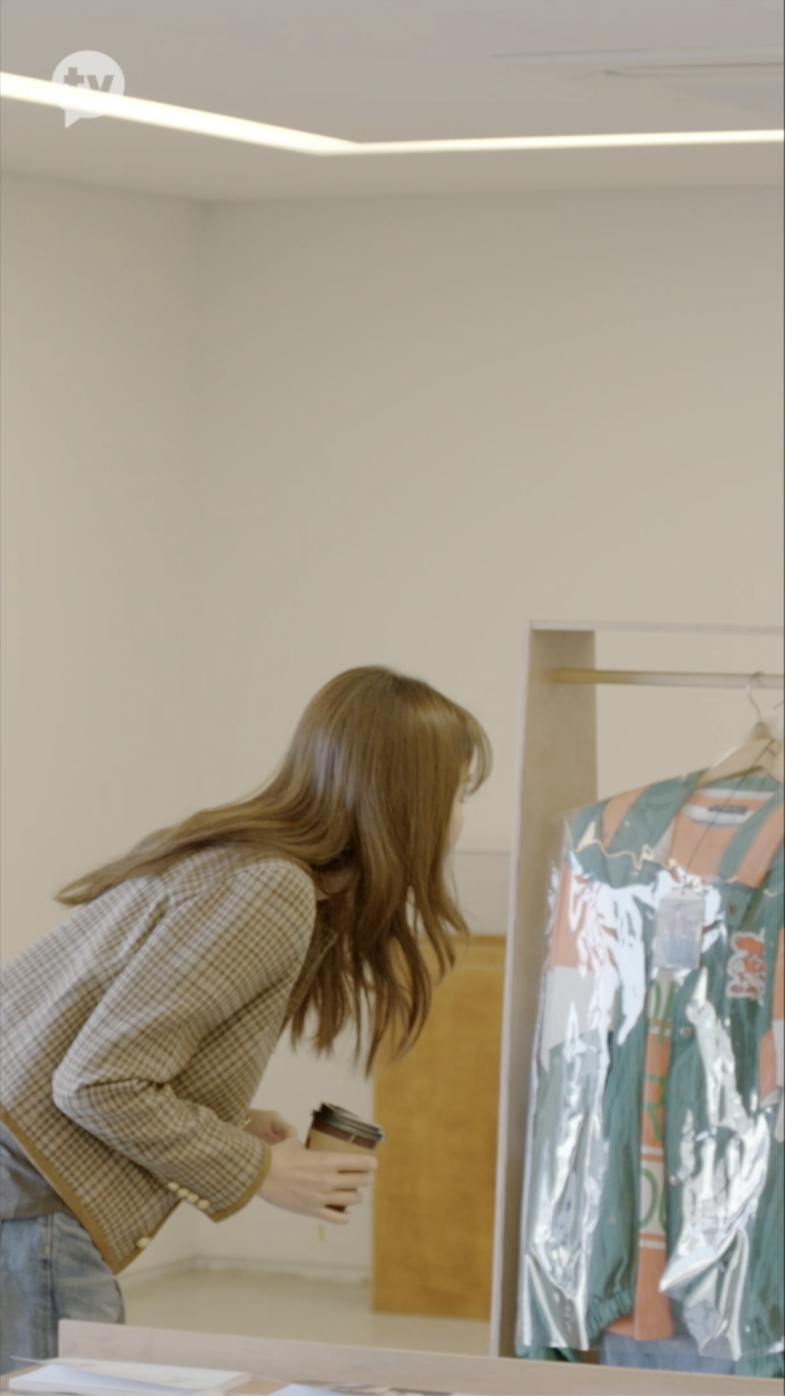 실제로 매장은 층고가 그리 높지 않은 공간이라, 세로형인 우리 화면에서는 벽에 투사한 프로젝션 영상이 짧게 끊기고 천장이며 조명 설비가 고스란히 다 잡혔다. 두 출연자를 강조하기 위해 추가로 설치한 조명도 프로젝션이 끝나는 벽에 그대로 걸려서 모양새가 별로였다.