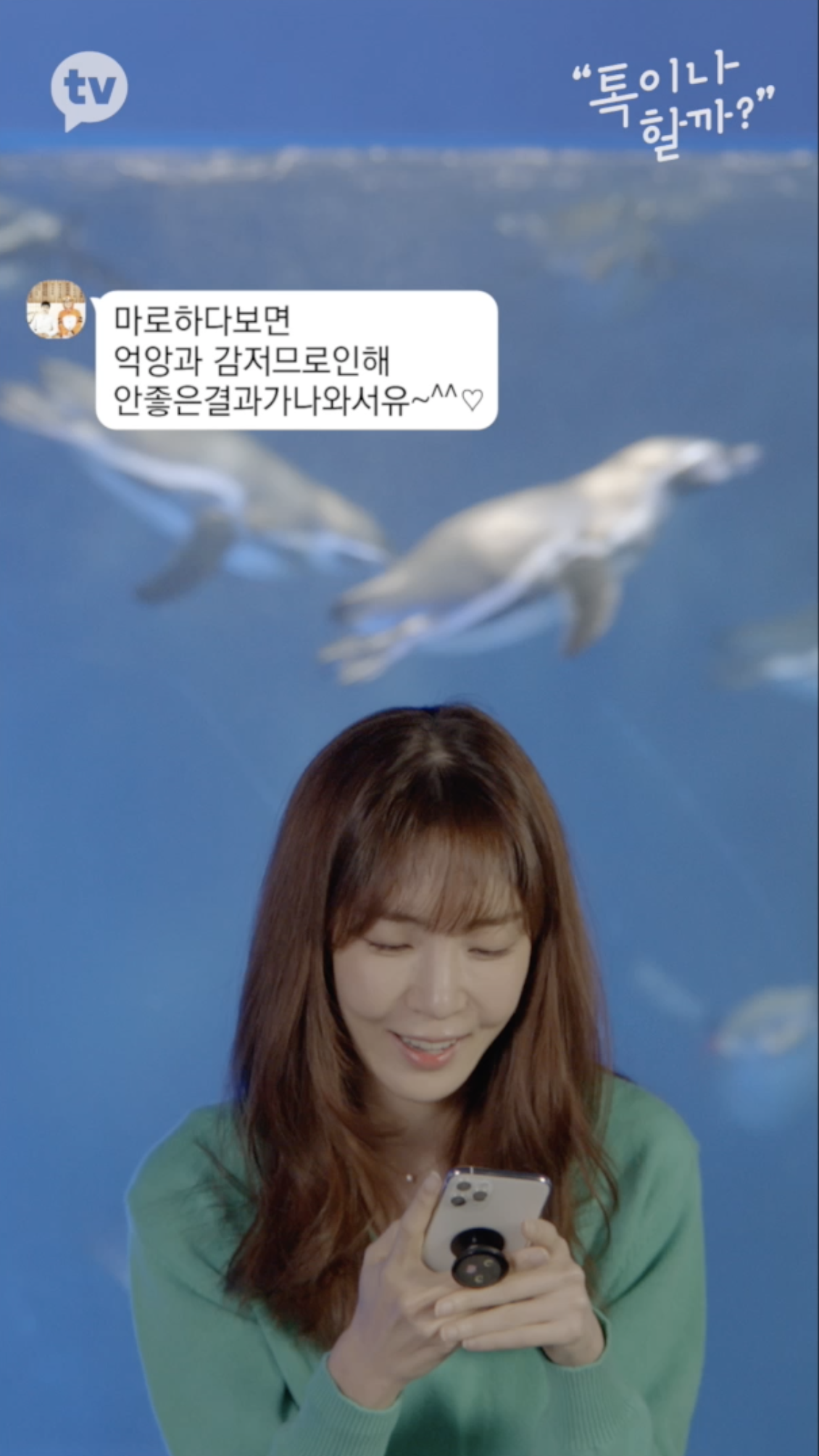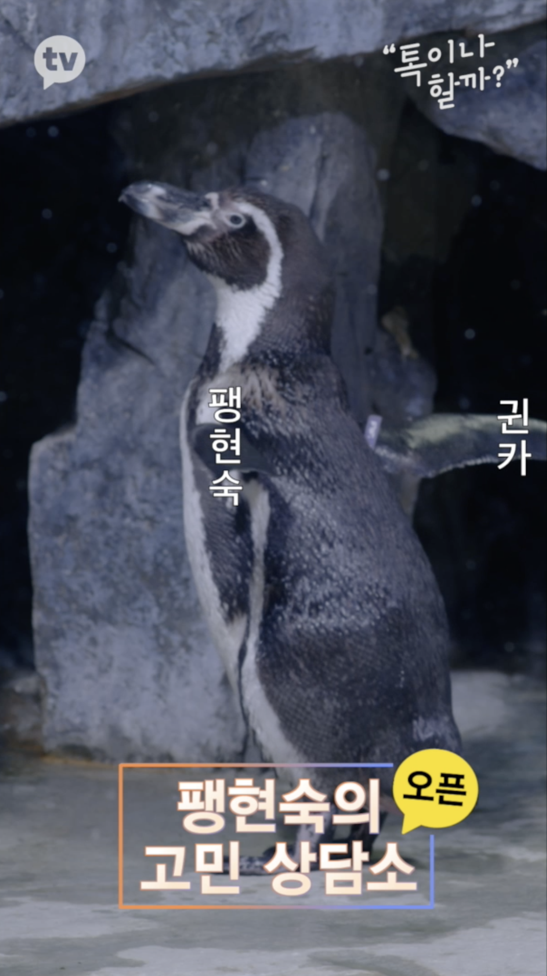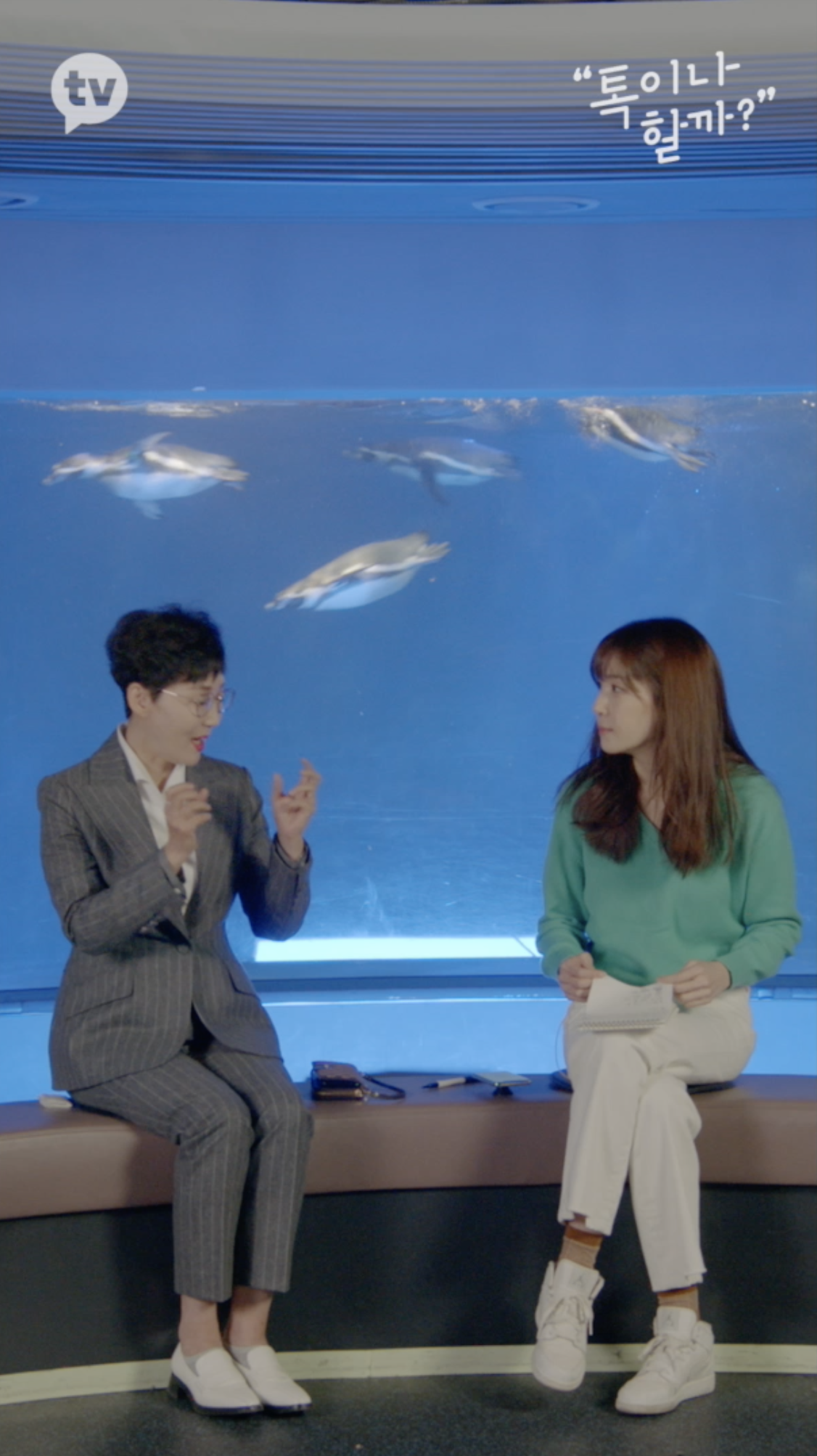 그래서 팽현숙 씨가 섭외됐을 때, 평소와는 좀 다른 결을 보여줄 수 있을 것 같다고 생각해 이PD에게 맡겼더니 아쿠아리움을 섭외해왔다. 팽현숙이니까 펭귄 앞에서 찍으면 어떻겠냐고. 듣자마자 빵터졌다. 과연 카톡을 하는 두 사람의 머리 뒤로 종횡무진 날아다니는 펭귄들의 그림은 가히 경이로웠다.