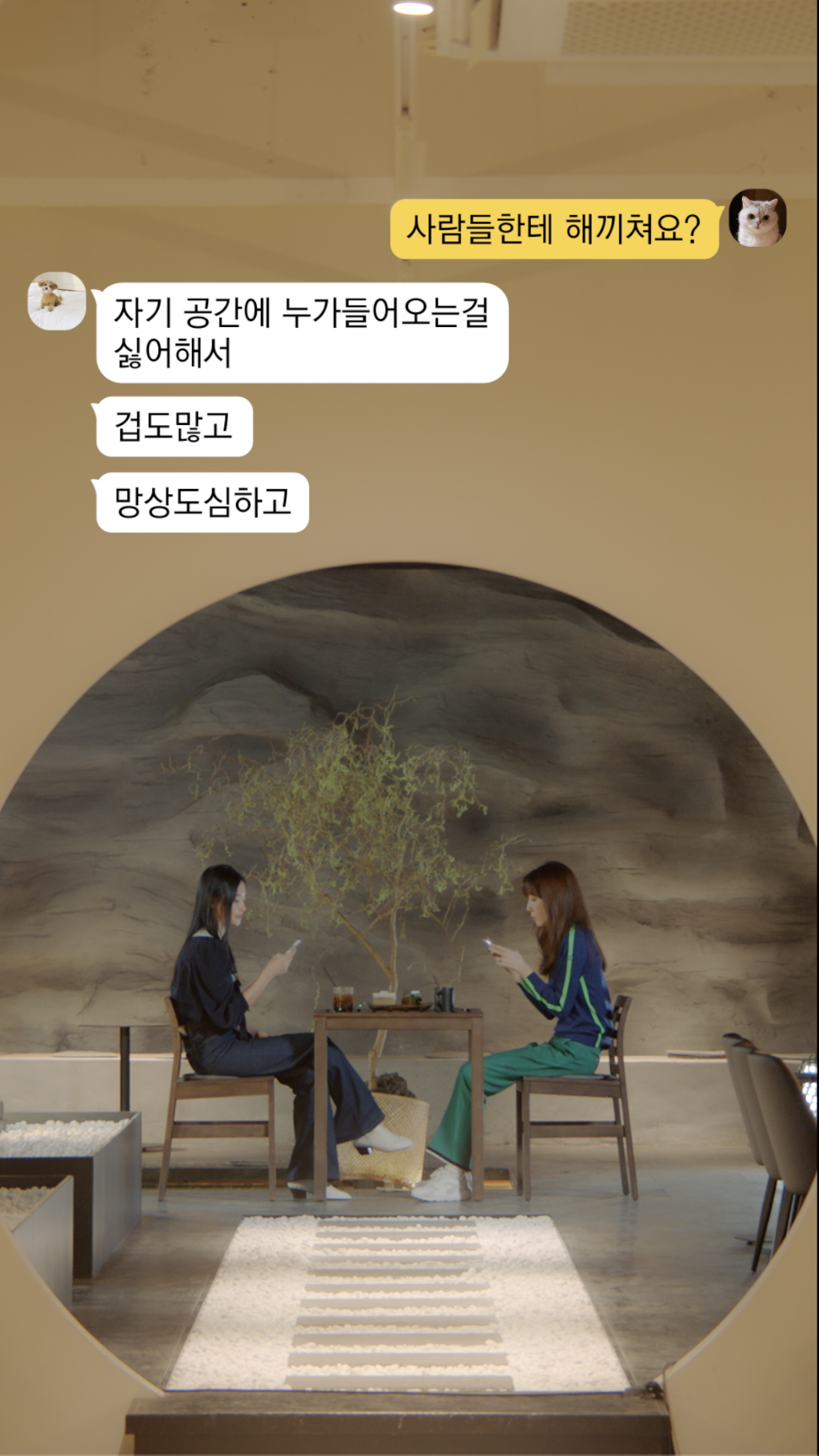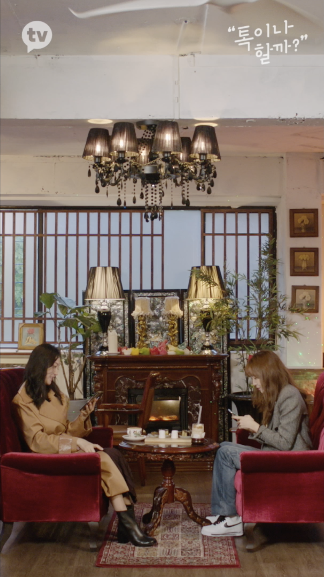 하지만 실제 촬영 시간은 몹시 짧고, 실제로 썸을 타는 두 사람의 카톡을 우리가 몇 날 며칠 따라다니며 촬영할 수는 없다. 그럼 짧은 시간 동안 이러한 카톡의 긴장을 극대화할 수 있는 세팅이 무엇일까 고민한 결과가 '따로 있지만 서로의 존재가 은근히 느껴지는' 공간이었다.