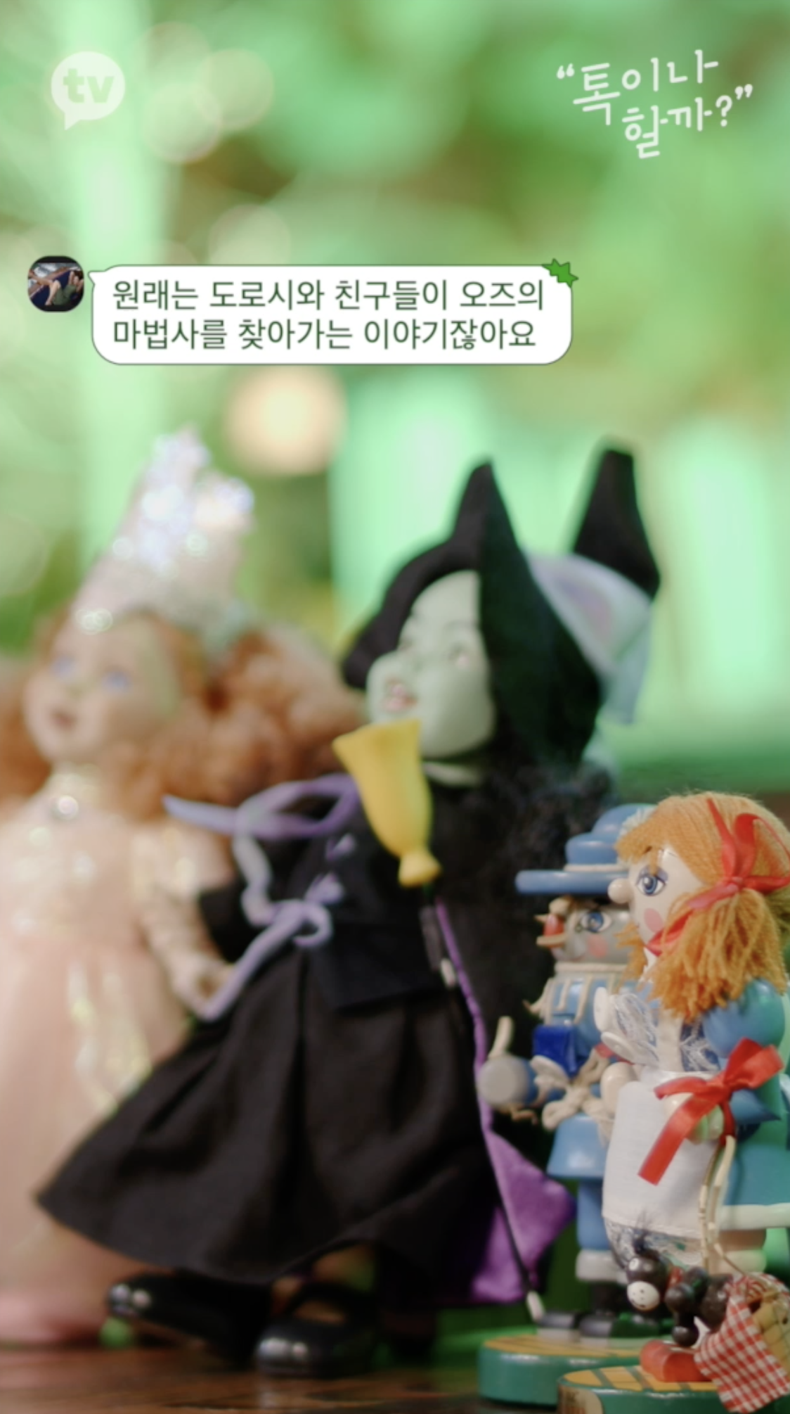 톱니바퀴를 찾아냈으니 나머지는 쉬웠다. <위키드>의 상징인 녹색이나, 마녀들이 주인공이라 느껴지는 신비로운 분위기는 우리 장비로도 충분히 구현할 수 있으니까. 원래는 회색톤인 '올드문래'의 벽에 녹색조명을 비추고, 포그를 깔아서 <위키드>의 분위기를 연출했다. 작품을 설명할 때 인서트로 활용할 '오즈의 마법사' 인형들은 물론이고.