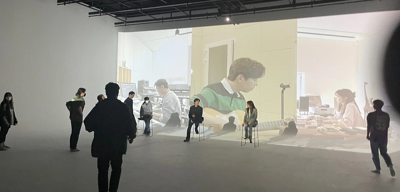 그럼 기존의 소스들을 활용하는 메이킹필름의 서사는 그대로 가지고 가되, 정말 그걸 잘라 붙이기만 하는 편집영상 대신 다른 방식으로 보여주어야겠다고 생각했다. 연습장면들을 사용하되 편집된 화면을 그대로 내지 않는다면 다른 방법은 투사였다. 원래는 메이킹필름이었어야 할 소스를 대형 스크린에 투사하고, 그 앞에서 다시 노래를 부르는 모습을 찍는다면 같은 서사도 다르게 보여줄 수 있을 것 같았다.