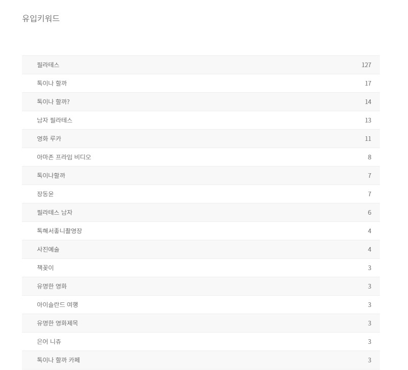 그리고 <톡이나 할까?> 제작과 관련된 글을 많이 썼다 보니 역시나 '톡이나 할까' 촬영지나 게스트를 검색한 흔적들이 많다. 그밖에 영화나 여행에 관한 글들을 드문드문 쓰니 관련 검색어들도 종종 보인다. 또 예능 제작 현장에서 쓰는 일본 은어들에 대한 글도 꽤 많이 읽혔어서, 해당 은어의 뜻을 궁금해하는 사람들이 꾸준히 검색해서 찾아 들어오는 것 같다.