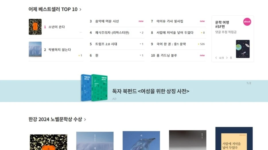 그러니까, 노벨문학상 수상은 한국의 언어와 역사를 공유하는 공동체 구성원으로서 다 말할 수 없는 기쁨이지만, 여전히 온라인 서점 일일 베스트셀러 상위권에서 내려올 줄 모르는 한강 작가의 책들이 출판계의 기대처럼 독서 문화를 다시 부흥시킬 수 있을지는 살짝 의문이 든다.