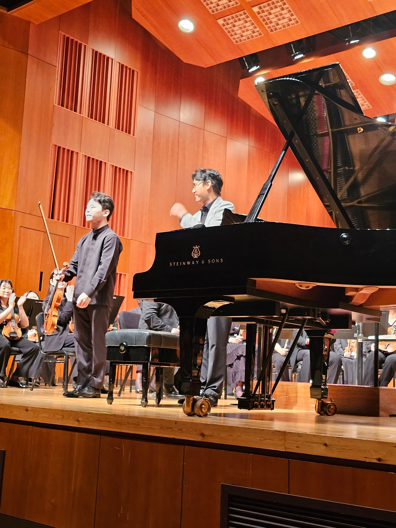 김동현님은 나이에 어울리지 않은 의연하고도 차분한 연주를, 또 때로는 그 또래에게서 느껴지는 열정과 거침없음을 보여주어서 관객들의 탄성을 자아냈습니다. 리허설 없이 즉석에서 정원님께서 김동현님과 타이스의 명상곡을 앙코르 연주로 선사해주신 시간은 분위기의 끝판왕이었습니다.